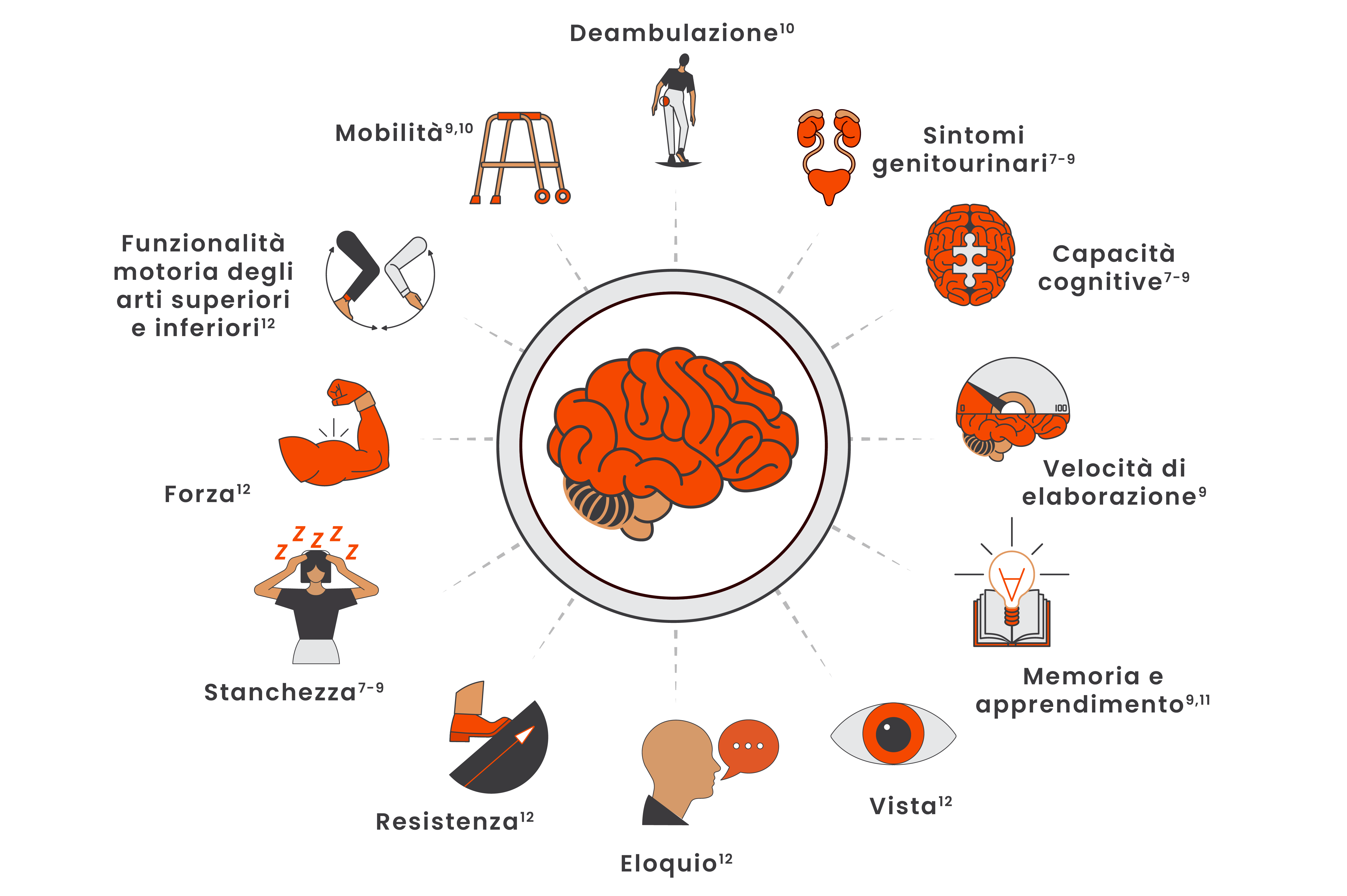 - Utilizzare regolarmente strumenti di valutazione clinica nella pratica, come il test dei 25 passi (T25-FW), il test dei 9 pioli (9-HPT) ed il test di associazione simboli-numeri (SDMT)13,14